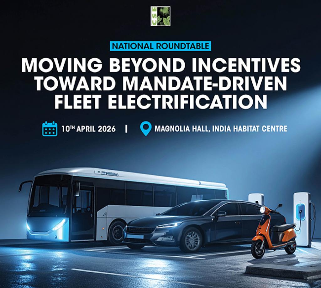 CSE's Clean Air and Sustainable Mobility team is organising a national multi-stakeholder roundtable on April 10, 2026, at India Habitat Centre, New Delhi, to deliberate on advancing India's Zero Emission Vehicle (ZEV) transition beyond its current incentive-led phase. The event will bring together policymakers, industry leaders, fleet operators, infrastructure providers, and subject-matter experts to examine the design and implementation of regulatory mandates, supply-side interventions, and sector-wide policy frameworks. Discussions will span OEM readiness, charging infrastructure and grid integration, state-level action, battery recycling, and critical mineral security - with the goal of charting a clear policy roadmap for deep, comprehensive electrification across all vehicle segments.