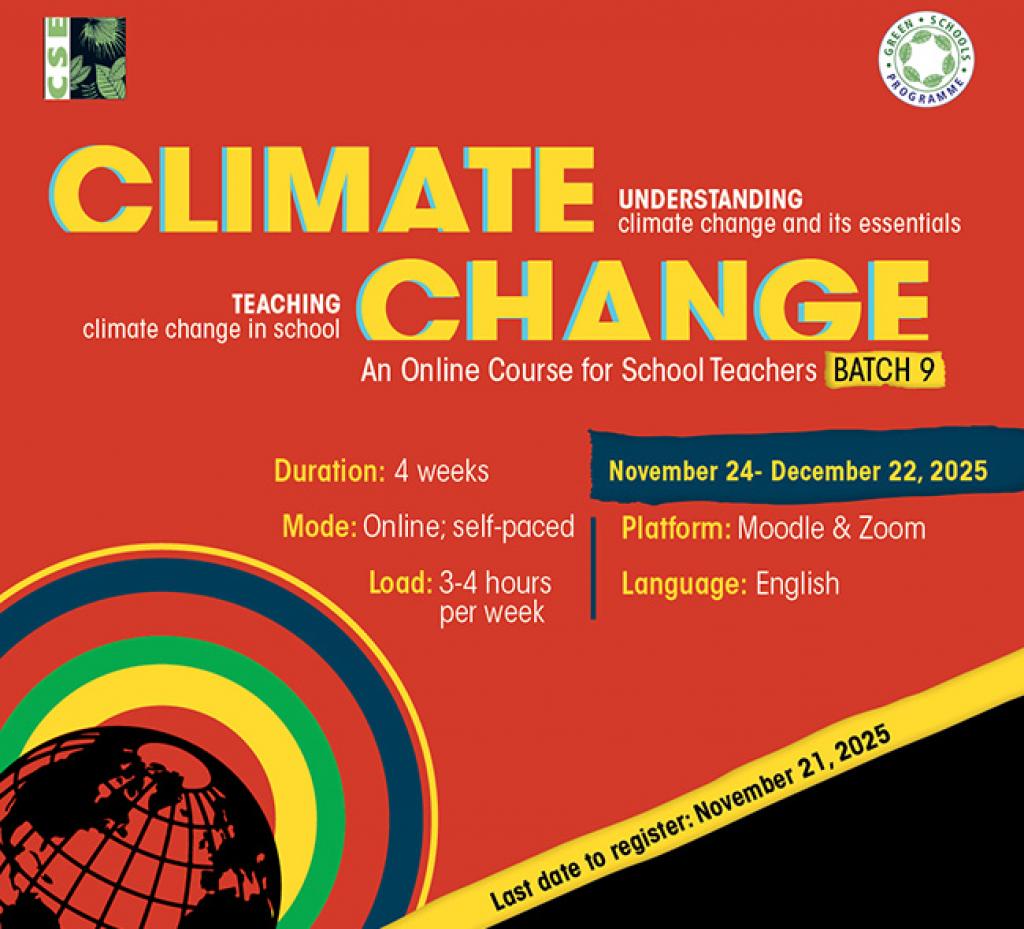 CSE’s Green Schools Programme (GSP) invites school teachers to delve into the fundamentals of climate change and register for Batch 9 of its Online Course on Climate Change for school teachers (Grades 5 to 12). The ninth batch of the course follows after the successful completion of eight batches and four onsite Climate Convocations.
