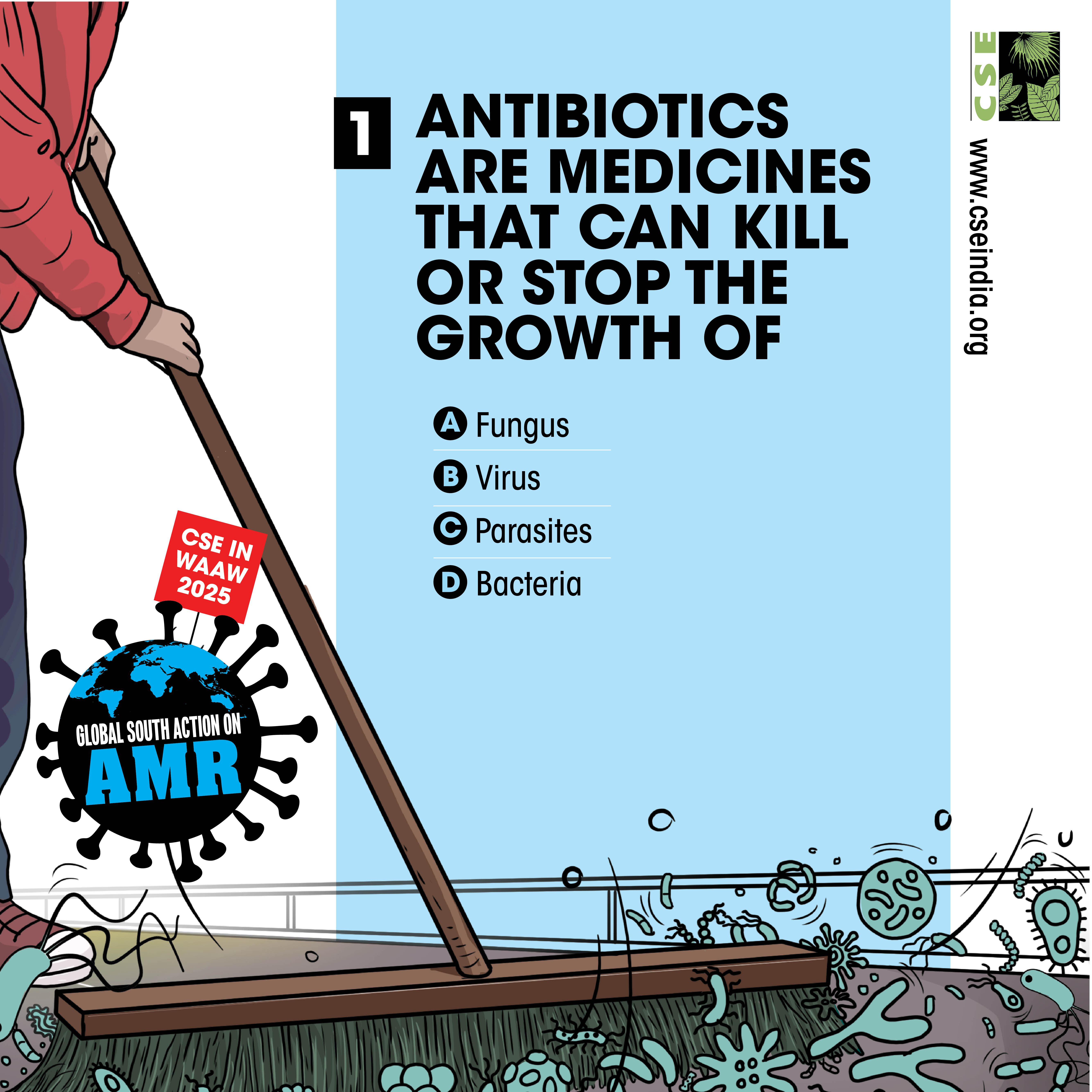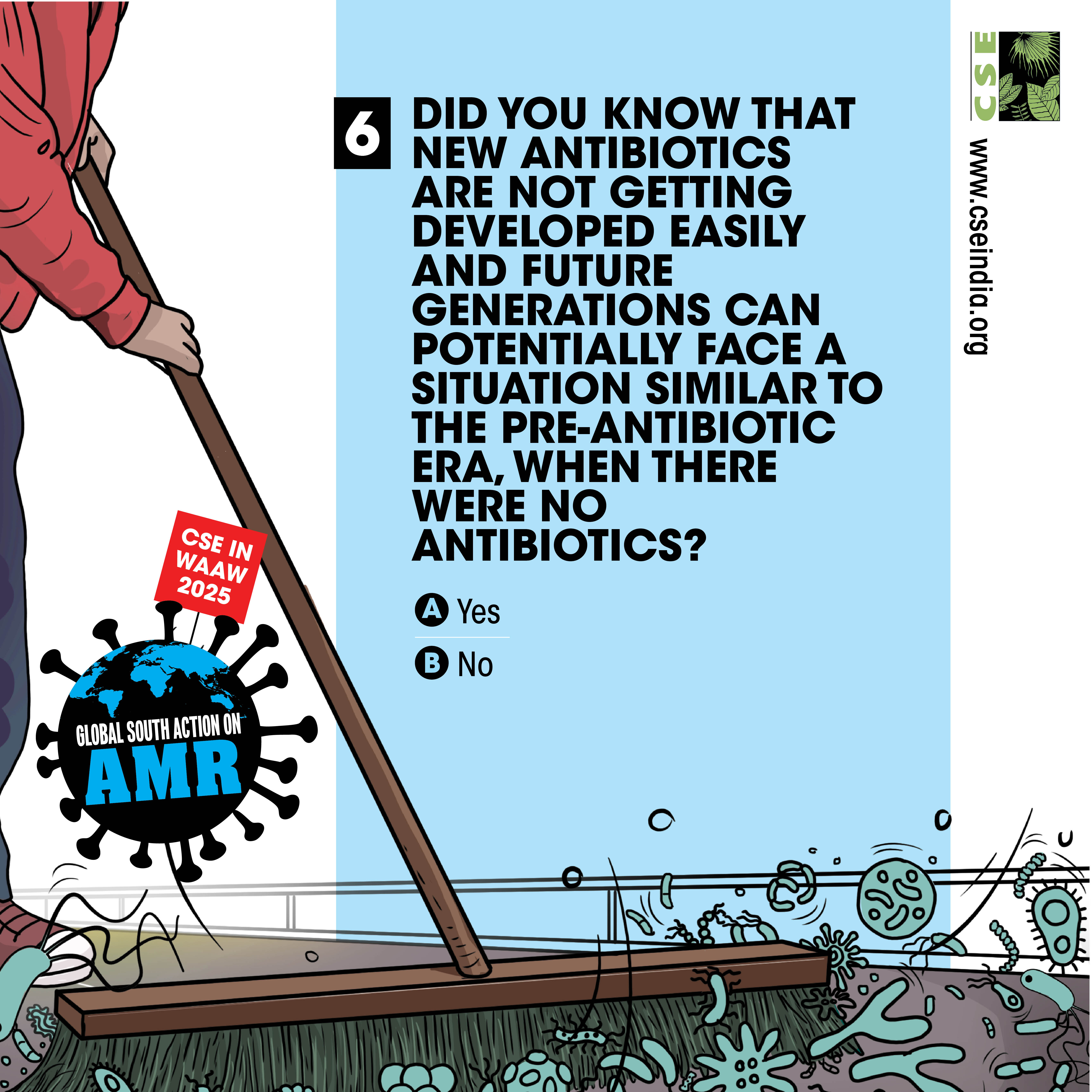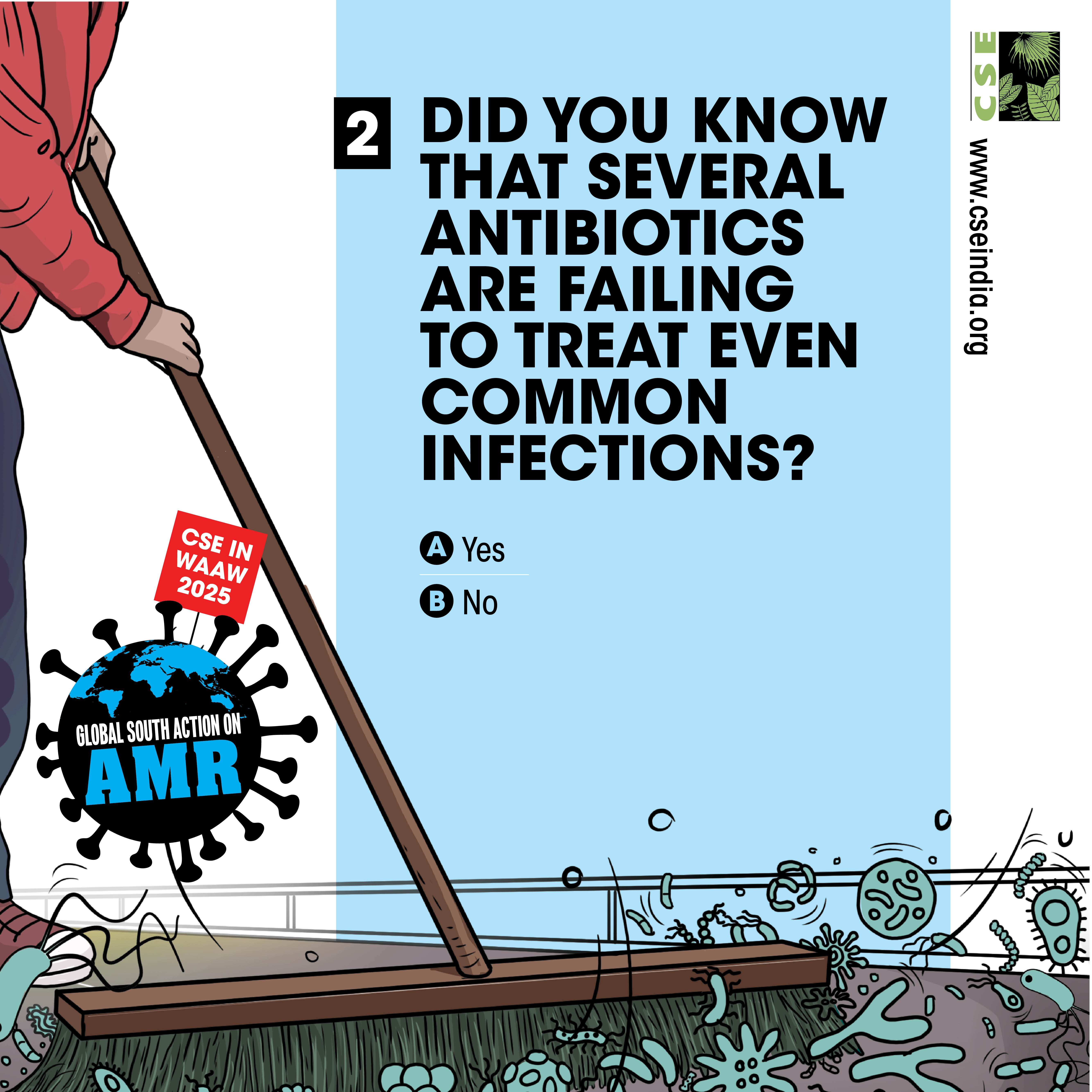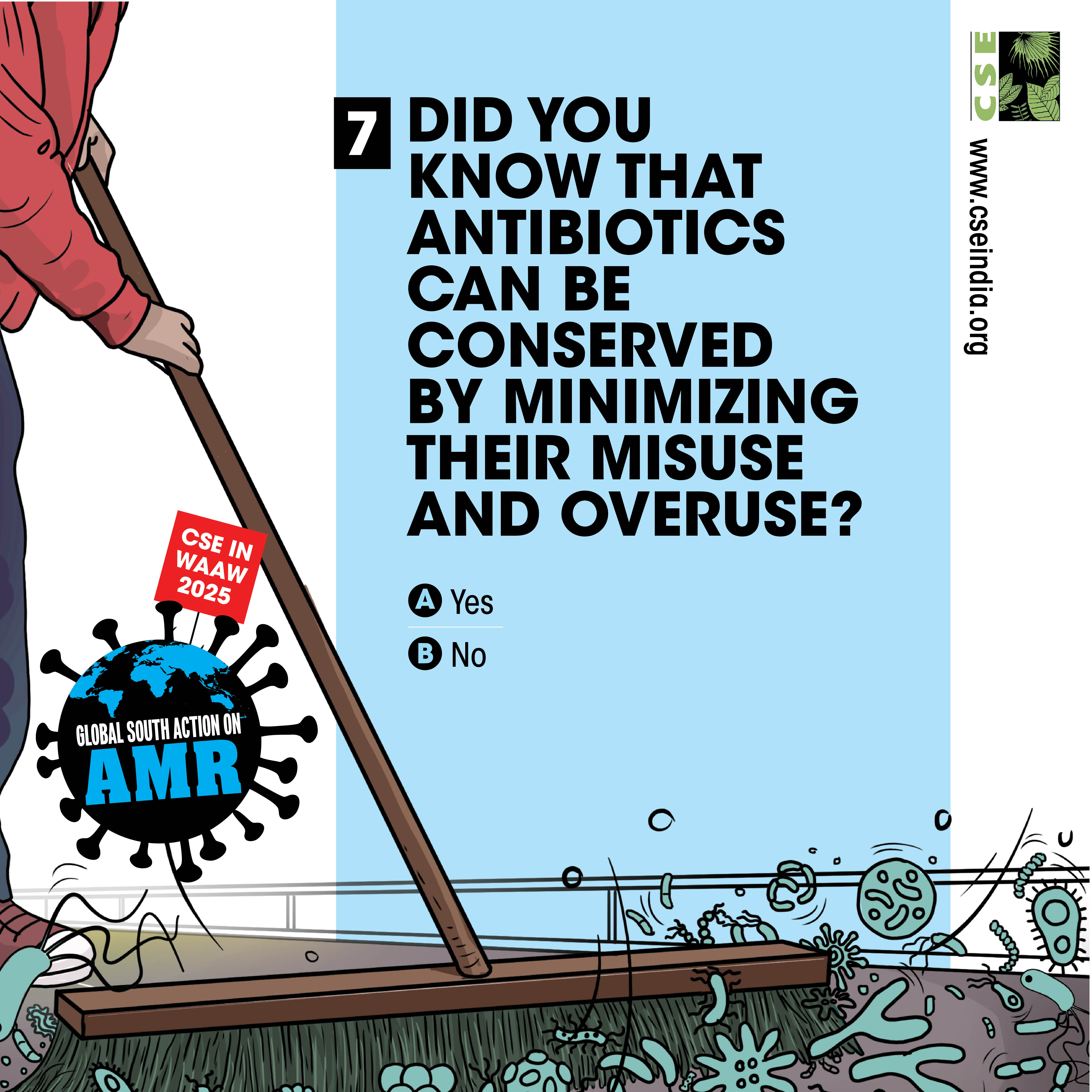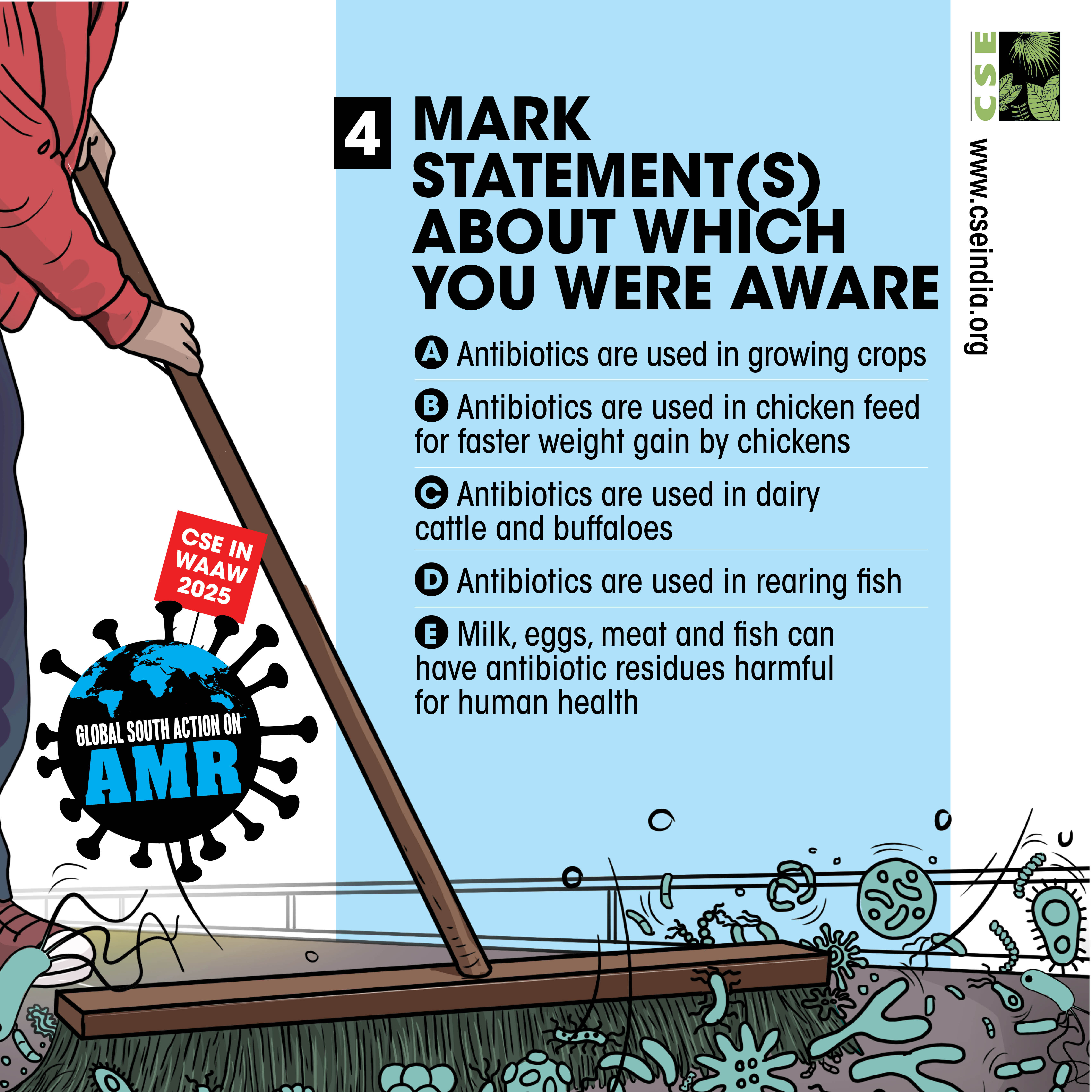The World AMR Awareness Week (WAAW) is a global campaign to raise awareness on AMR, and is celebrated from 18-24 November every year. The Centre for Science and Environment (CSE) marks this week each year through a global campaign. In its 10th year, the theme of CSE’s initiative is ‘Global South Action on AMR’, as part of which we will be engaging with experts and stakeholders to spread awareness about practices, key issues and solutions through webinars, videos, articles, opinion polls, online and social media campaigns. For about a decade and a half, CSE's Sustainable Food Systems team has been working towards an effective global response on antimicrobial resistance (AMR), particularly from the perspective of the global South. It is clear that the realities, challenges and possibilities of the Global South are different. There is a strong need to reflect the priorities and challenges of the Global South, so that the global response to AMR crisis is truly global, effective and sustainable. Our work on AMR can be seen here. The global theme for WAAW 2025 is “Act Now: Protect Our Present, Secure Our Future.”