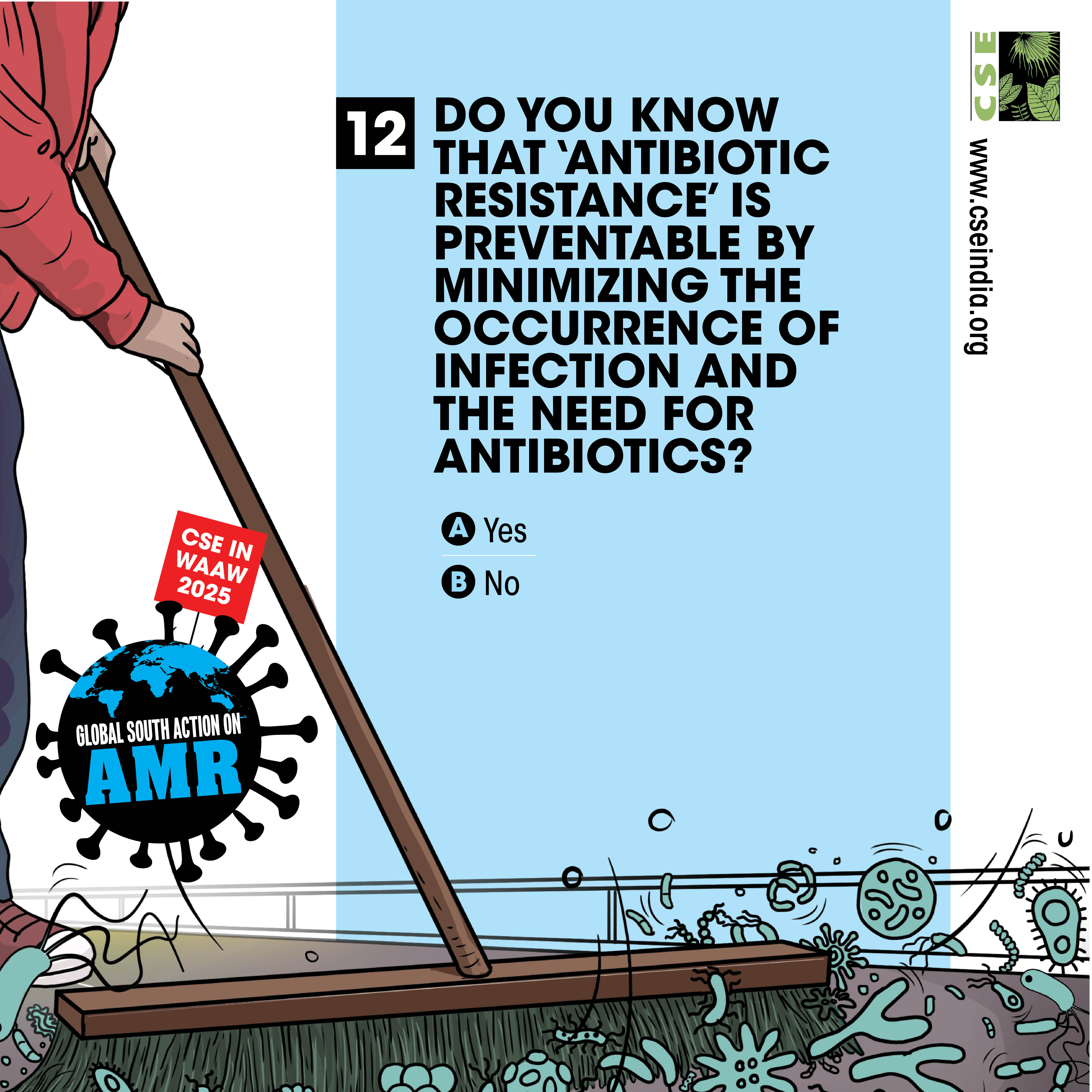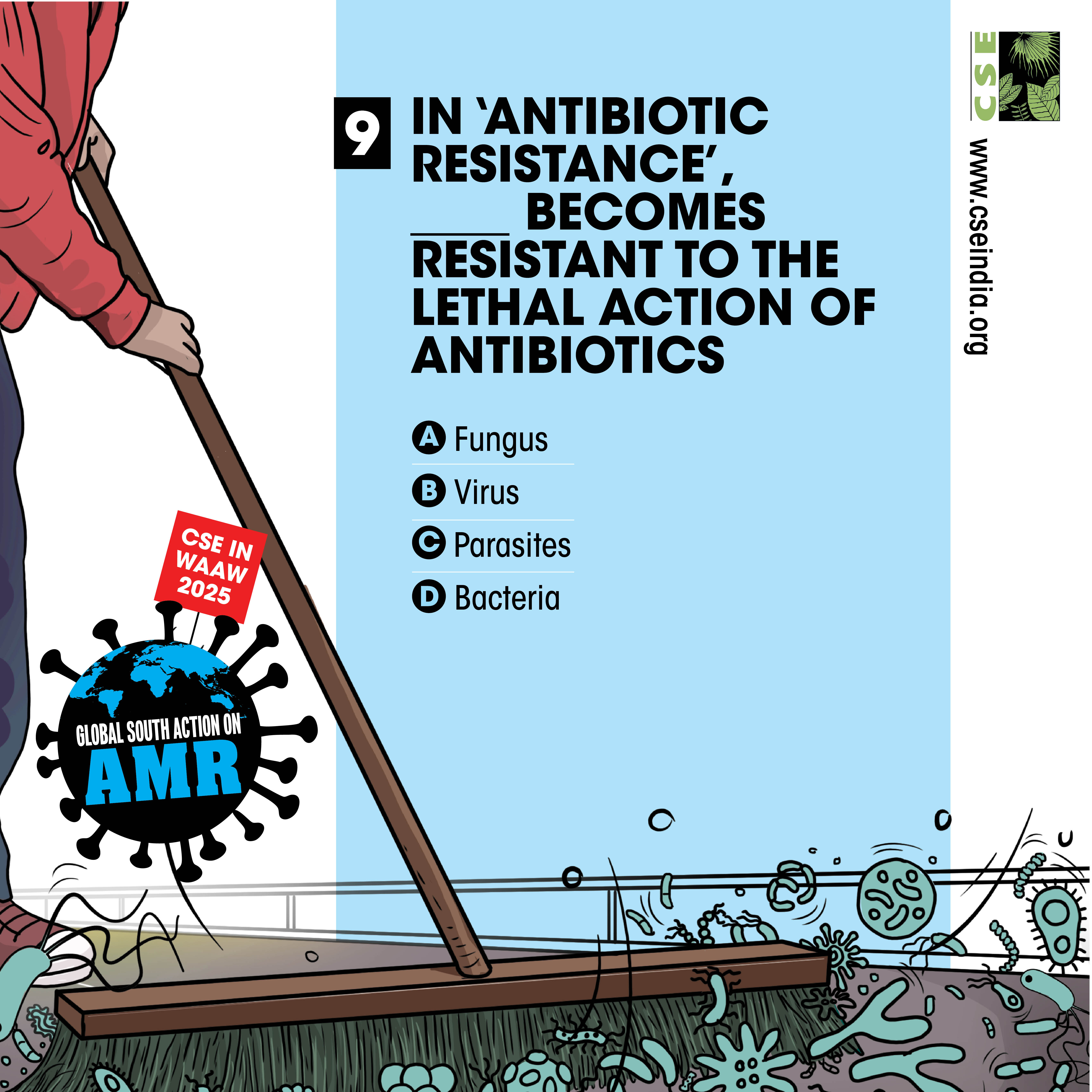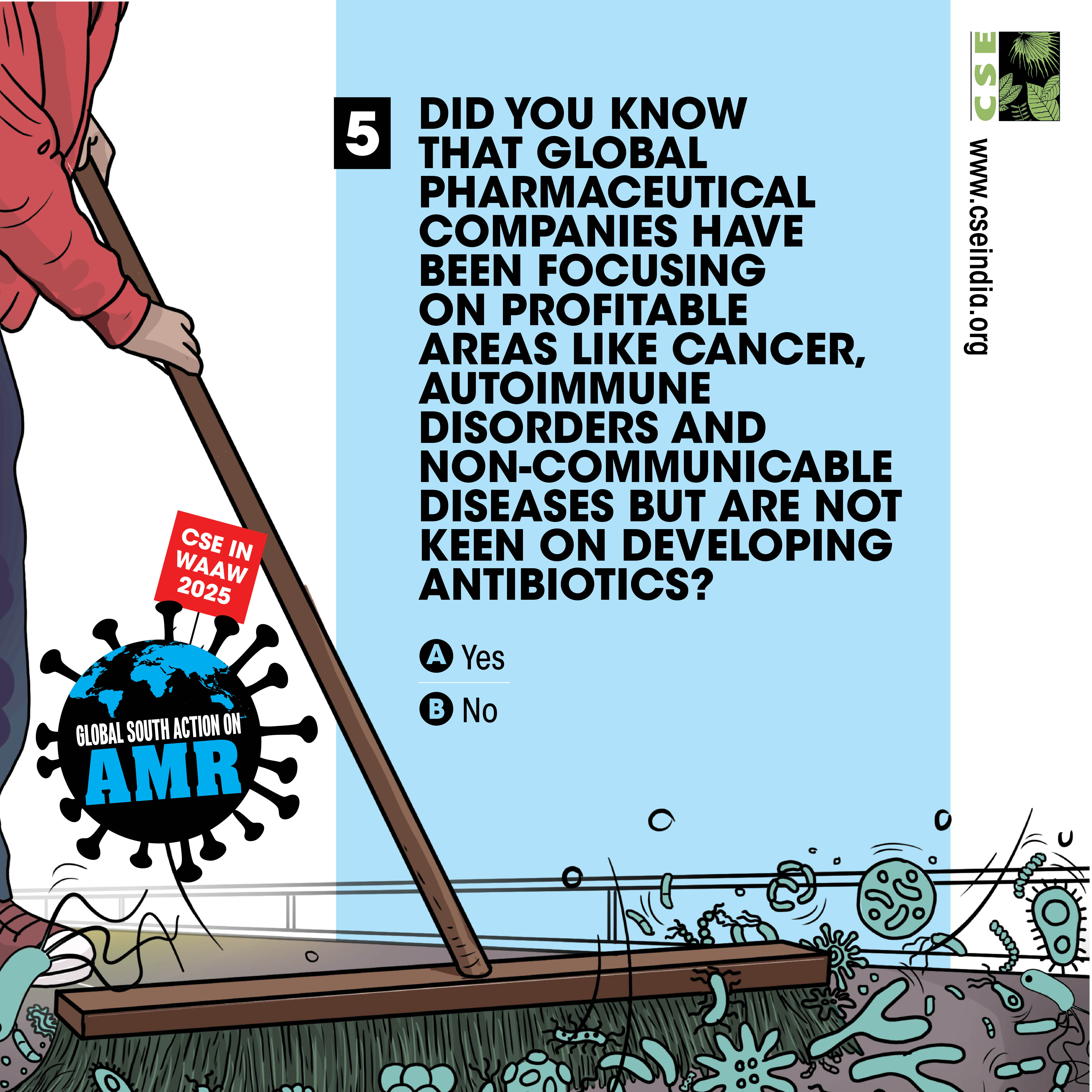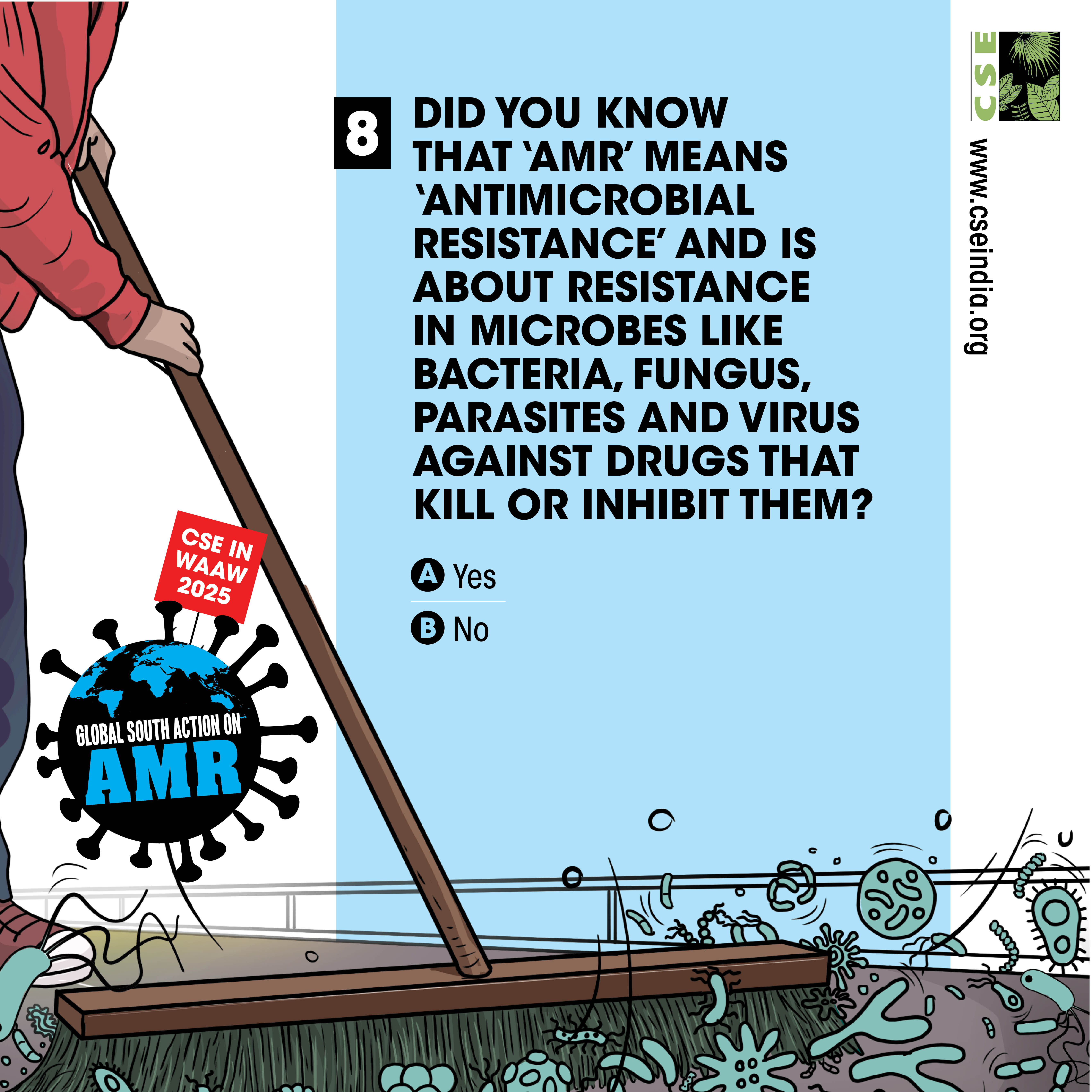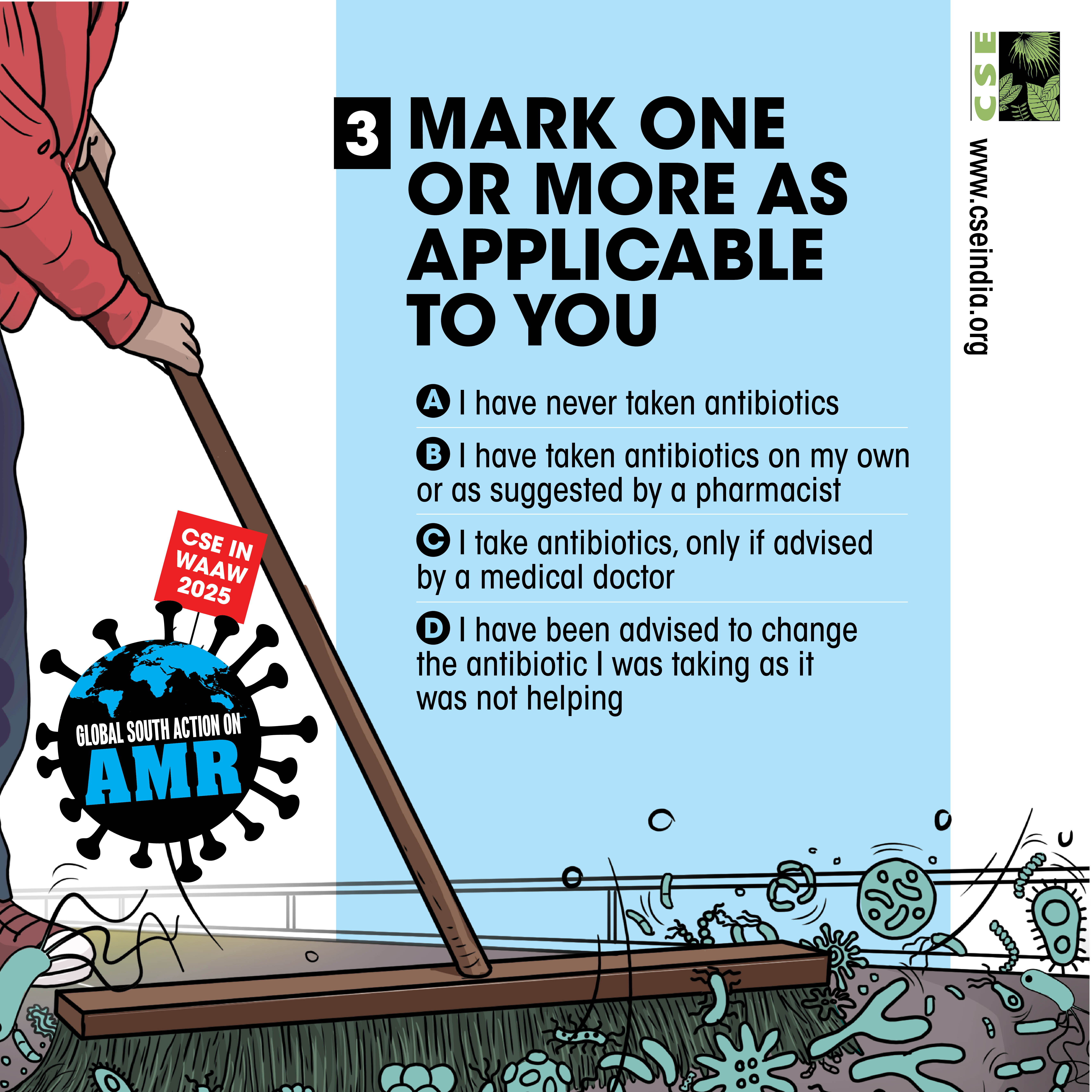 The World AMR Awareness Week (WAAW) is a global campaign to raise awareness on AMR, and is celebrated from 18-24 November every year. The Centre for Science and Environment (CSE) marks this week each year through a global campaign. In its 10th year, the theme of CSE’s initiative is ‘Global South Action on AMR’, as part of which we will be engaging with experts and stakeholders to spread awareness about practices, key issues and solutions through webinars, videos, articles, opinion polls, online and social media campaigns. For about a decade and a half, CSE's Sustainable Food Systems team has been working towards an effective global response on antimicrobial resistance (AMR), particularly from the perspective of the global South. It is clear that the realities, challenges and possibilities of the Global South are different. There is a strong need to reflect the priorities and challenges of the Global South, so that the global response to AMR crisis is truly global, effective and sustainable. Our work on AMR can be seen here. The global theme for WAAW 2025 is “Act Now: Protect Our Present, Secure Our Future.”