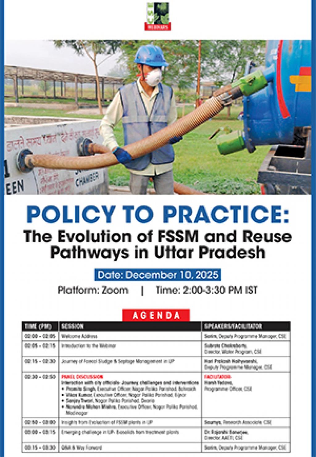 With the focus now shifting towards treatment and reuse of treated water and biosolids, a new set of challenges has emerged. CSE has consistently worked with the state to understand and confront these challenges – its 2024-25 evaluation of the performance of 25 treatment plants has been a crucial step in that direction. We invite all to a webinar to capture and celebrate UP’s FSSM journey, as well as to discuss the issue of managing and reusing the biosolids and treated wastewater coming from treatment plants.