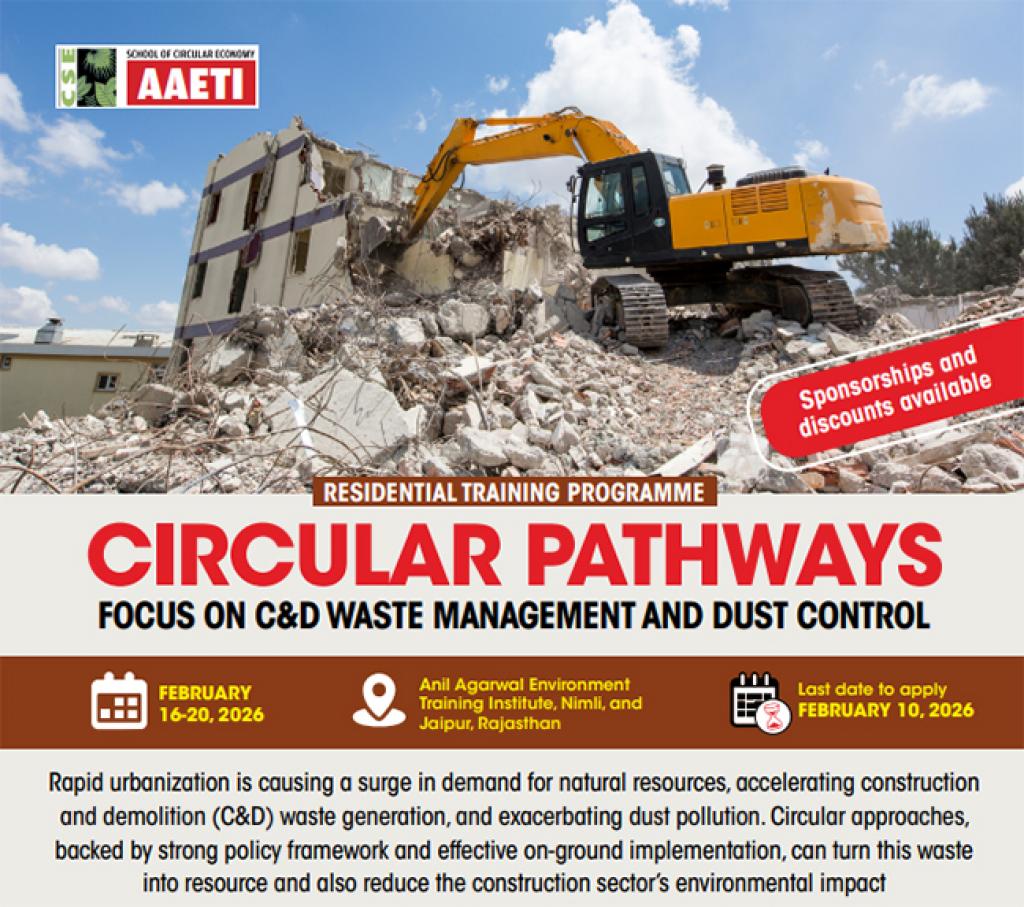 CSE’s Anil Agarwal Environment Training Institute (AAETI) offers a residential training program that equips professionals from the built environment and construction industry, urban local bodies (ULBs), and Pollution Control Board officials with the knowledge and tools to build this seamless ecosystem. The training covers a cradle-tocradle approach for C&D waste management, compliance requirements, and actionable strategies for achieving circularity in construction. The course also addresses gaps between policy and practice, offering insights into circular economy strategies for the construction sector.