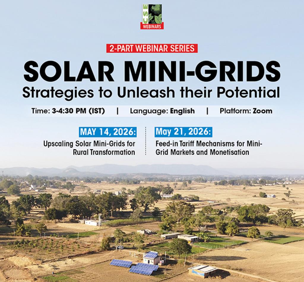 Centre for Science and Environment (CSE) invites you to a two-part webinar series that will bring together practitioners, policymakers and researchers to examine what it will take to move decentralised solar from isolated field successes to systemic impact — drawing on two recently published CSE reports. The discussions are expected to bring together cross-regional experiences to identify what can be scaled, what remains context-specific, and what must change in policy and practice to move from isolated successes to systemic impact.