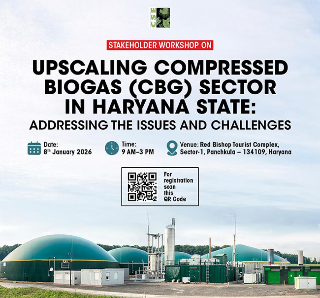 Haryana has a significant presence in the CBG sector, state has 17 operational plants at present, making it one of the top three states in India for operational CBG capacity. CSE under its initiative to strengthen the CBG ecosystem has done a sectoral study of the state. The study focused on understanding feedstock supply chains, off-take models, by-product management, cost economics, and scalability aspects of CBG production. The study is conducted with major objective of documenting good practices, identify challenges, and propose pathways for strengthening the ecosystem at the feedstock, manufacturing, and policy levels. To take this dialogue forward, CSE is conducting a "Stakeholder Workshop on Upscaling CBG sector in Haryana State: Addressing the issues and challenges" in Panchkula. The meeting will bring together key stakeholders including industry, policymakers, farmers and experts to share experiences, deliberate on sectoral challenges, and explore opportunities for scaling up CBG initiatives in the state